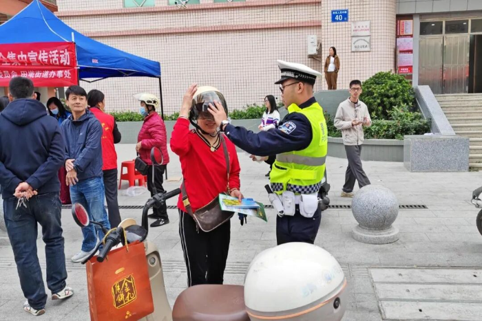 活动中,宣传人员在南联路口、新时代文明实践站、万家好等重要路口、路段设立劝导点,通过对未按规定佩戴安全头盔的摩托车、电动自行车骑乘人员进行拦截,结合典型事故案例,面对面地分析讲解事故成因,让群众深入了解头盔在关键时刻对生命安全的重要保护作用。同时,民辅警还通过分发宣传材料、发放安全头盔、示范安全头盔的正确佩戴方法等方式,引导大家树立“戴好头盔、安全出行”的安全防护意识,做到自觉预防事故,克服麻痹、侥幸心理,共同营造安全、文明、和谐的道路交通环境。