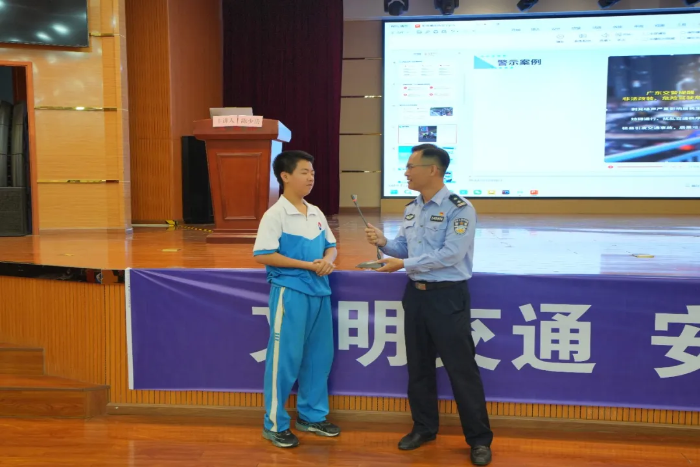 为使交通安全知识真正入脑入心,讲座设置了法律知识问答、头盔佩戴示范、谈心得感想等环节。围绕骑行年龄要求、乘车安全规范、“一盔一带”和“早点走 靠右行 慢慢开”骑行理念等核心要点内容,民警与现场学生进行了严肃而富有教育意义的互动。