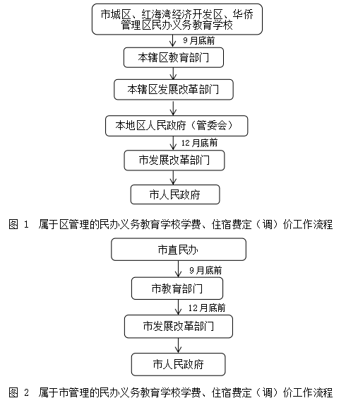 1.对于根据教育部门分级管理规定属于城区、红海湾经济开发区和华侨管理区管理的民办义务教育学校提出的定(调)价申请,本地区人民政府(管委会)进行初审后,于12月底前上报市发展改革部门,再由市发展改革部门按政府制定价格有关程序进行审核后报市人民政府批准执行。