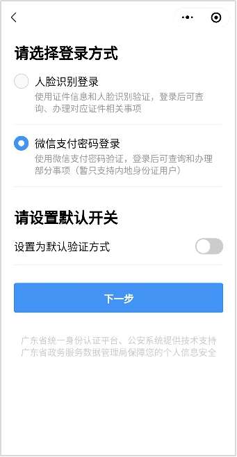 进入服务界面后,如未进行实名认证,可根据界面相应提示实名认证,当前可选“微信支付密码认证”、“人脸识别认证”两个认证方式。