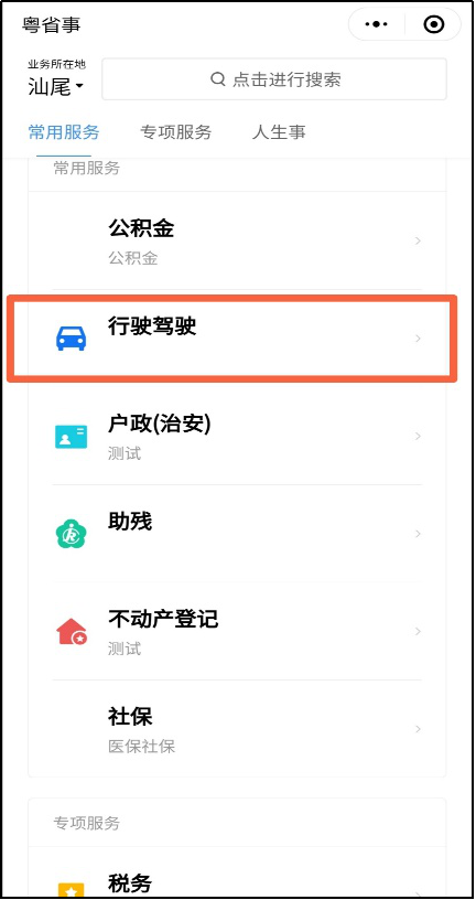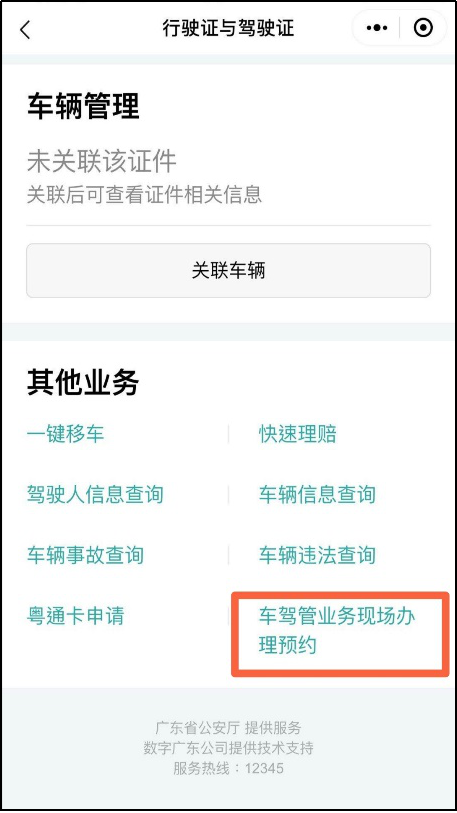 预约人扫描下方葵花码或打开“粤省事”微信小程序,进入“行驶驾驶”服务,下拉点击“车驾管业务现场办理预约”。