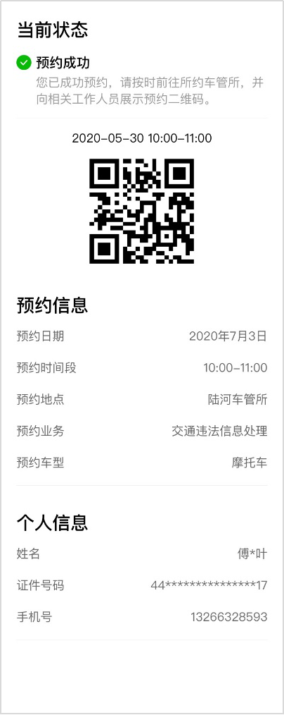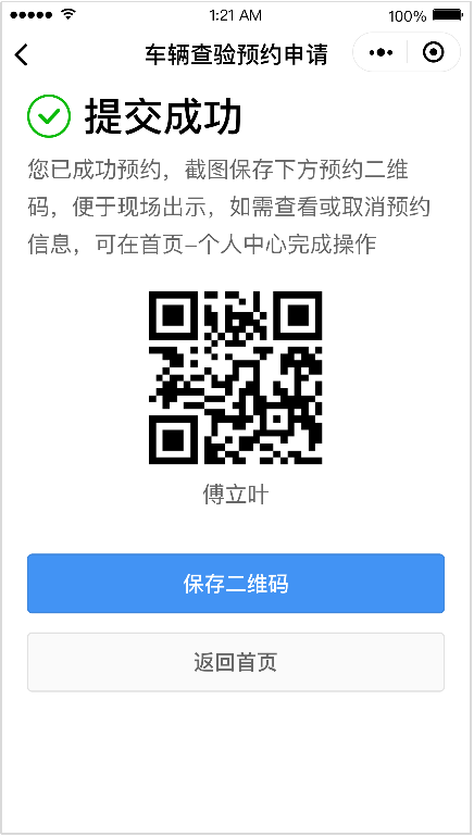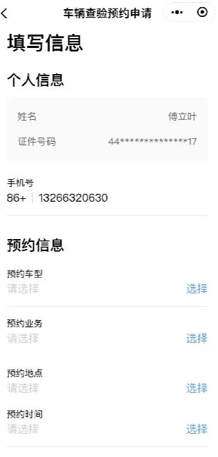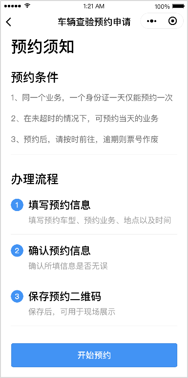 阅读预约须知后,点击“开始预约”进入预约界面,准确填写预约车型、业务、时间、地点等信息,并进行提交。提交成功后,将生成预约二维码。在到达车管所现场后出示预约信息,以供检验员检验预约情况。