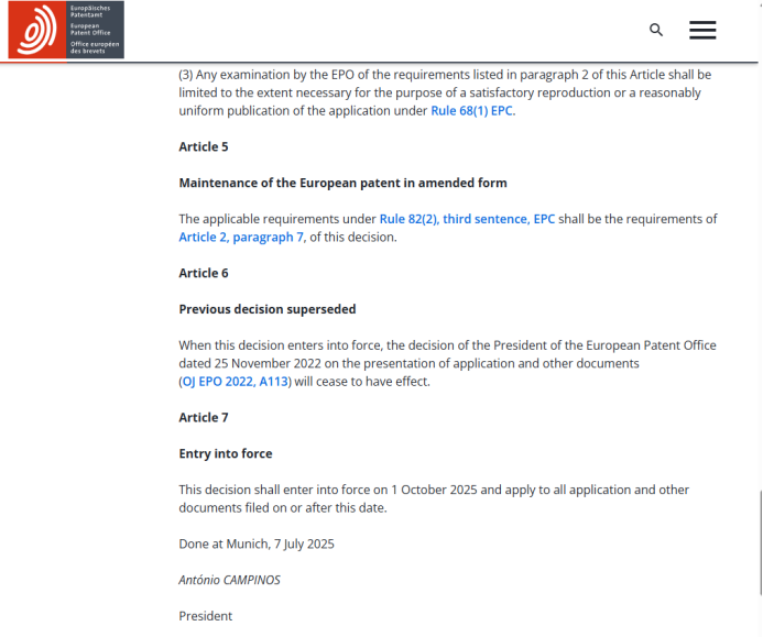 根据2025年7月7日《EPO局长关于申请文件及其他文件呈现形式的决定》第1条第(2)款(a)项,自2025年10月1日起,向EPO提交的申请文件中的附图可以为彩色。