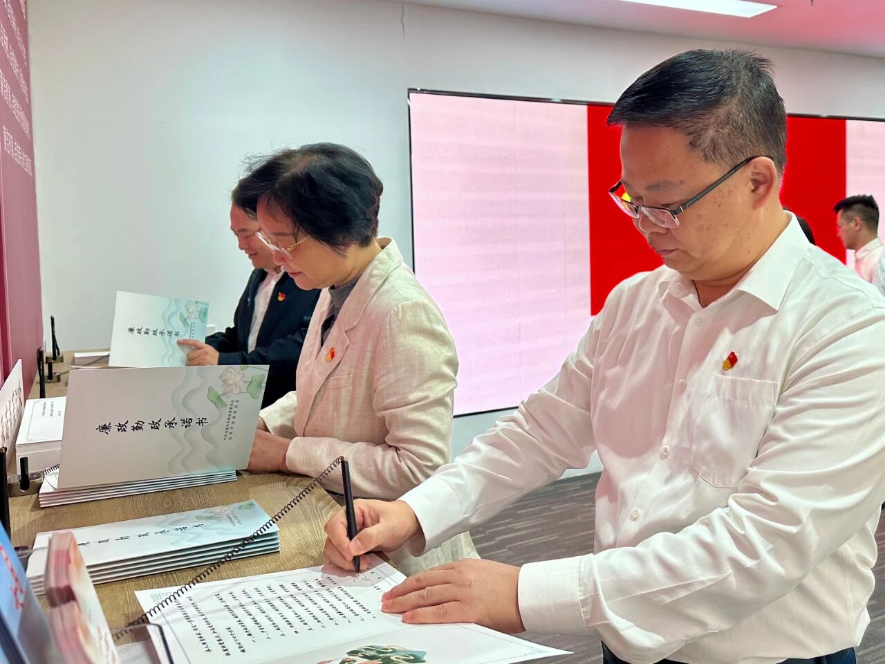 在廉政教育基地,党员干部依次参观了“百年风华”“海陆廉韵”“警钟长鸣”“固本清源”等主题展厅,认真聆听讲解,重温习近平总书记有关全面从严治党的谆谆教诲,深入了解我市党风廉政建设和反腐败斗争取得的成果。一个个发生在身边的真实案例、一段段发自肺腑的忏悔影像,生动揭示了从“一念之差”到“一墙之隔”的深刻教训,警示党员干部必须时刻绷紧廉洁自律这根弦,做到警钟长鸣、防微杜渐。活动中,全体党员干部面向党旗庄严宣誓,重温入党誓词,并现场签署了《廉政勤政承诺书》。