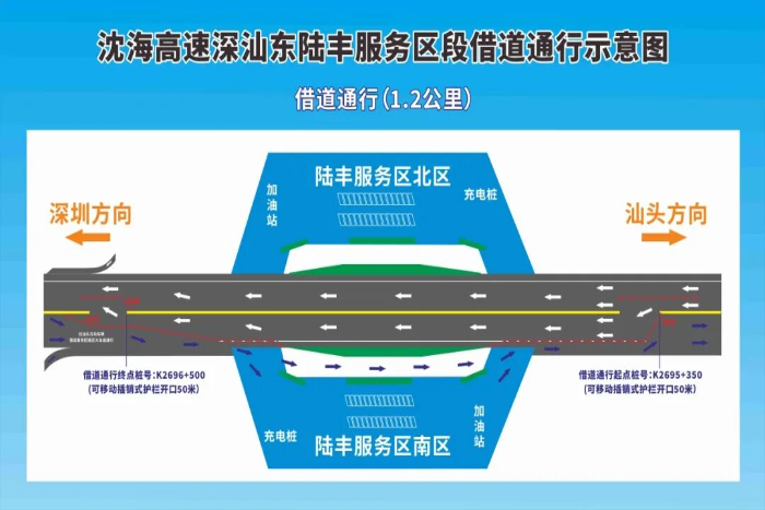 1.根据沈海高速深圳方向陆丰服务区路段的交通缓行拥堵情况,汕尾公安交管部门联合深汕东公司将在K2696+500至K2695+350路段首次启动“潮汐车道”通行措施。工作人员打开位于陆丰服务区路段西行与东行方向之间预留的中央隔离护栏开口。引导西行(往深圳方向)的拥堵车流借用对向的车道通行,通过服务区路段后再返回西行原路。同时,为保障通行安全,原东行(往汕头方向)的车流以及从霞湖收费站上高速往汕头方向的车流,将被统一引导进入陆丰服务区南区,利用服务区大货车道绕行后,再重新汇入高速主线继续行驶。