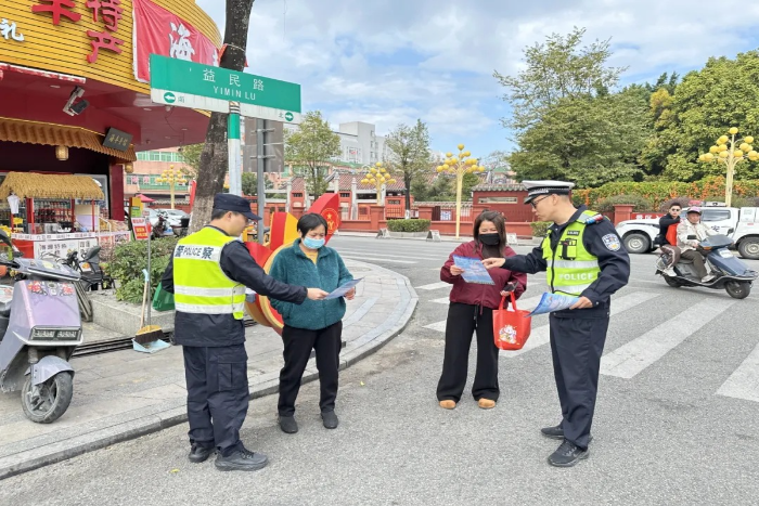 新春将至,年味渐浓。随着在外务工人员返乡、学生放假、群众探亲旅游客流集中,返乡车流、出行人流日益增多,为守护群众平安团圆,切实筑牢春运道路交通安全防线。连日来,汕尾公安交管部门组织民辅警深入社区居民、市井巷陌、商场超市、公司企业、夜市景点等场所,将交通安全叮嘱做到“入户上门”,为春运及春节期间道路交通安全保驾护航。