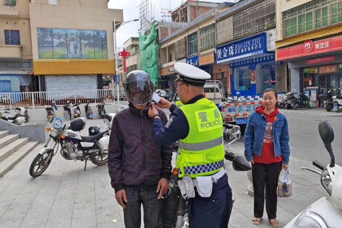 活动中,宣传人员在南联路口、新时代文明实践站、万家好等重要路口、路段设立劝导点,通过对未按规定佩戴安全头盔的摩托车、电动自行车骑乘人员进行拦截,结合典型事故案例,面对面地分析讲解事故成因,让群众深入了解头盔在关键时刻对生命安全的重要保护作用。同时,民辅警还通过分发宣传材料、发放安全头盔、示范安全头盔的正确佩戴方法等方式,引导大家树立“戴好头盔、安全出行”的安全防护意识,做到自觉预防事故,克服麻痹、侥幸心理,共同营造安全、文明、和谐的道路交通环境。
