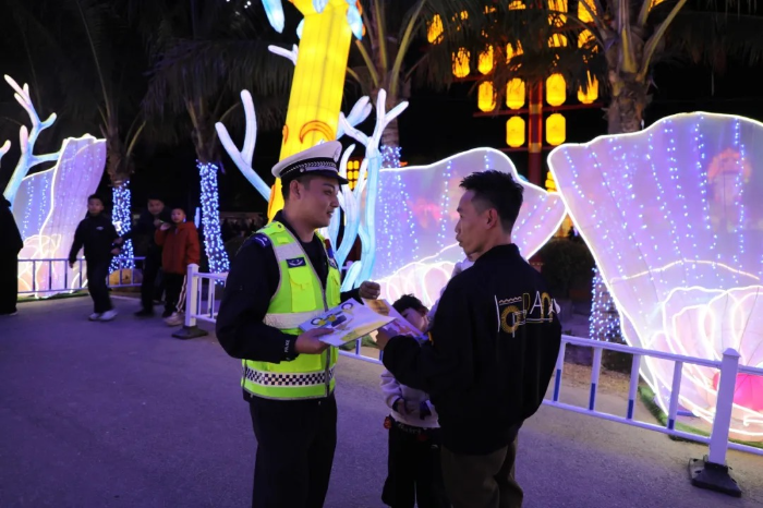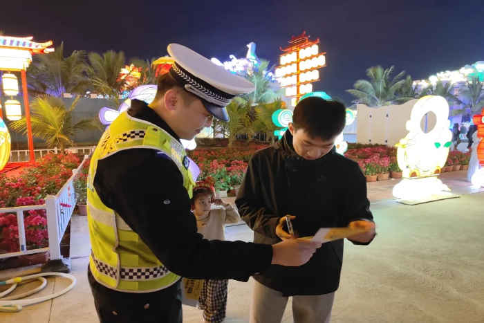 2026年2月11日晚,汕尾公安交管陆丰大队组织宣教民辅警走进陆丰市上海外滩景区,化身游客身边的“安全向导”,用唠家常的方式讲解景区周边路况与出行要点,强调“一盔一带”的重要性,提醒大家夜间出行要做好安全防护,“一老一少”群体要穿搭鲜艳反光的外衣,夜间出行“被看见才安全”。驾驶车辆途经农村平交路口要减速慢行,注意观察过往车辆和行人,做到“一慢二看三通过”。本次宣传活动,把生硬的交规变成贴心的叮嘱,让交通安全宣传真正融入到游玩时光中。