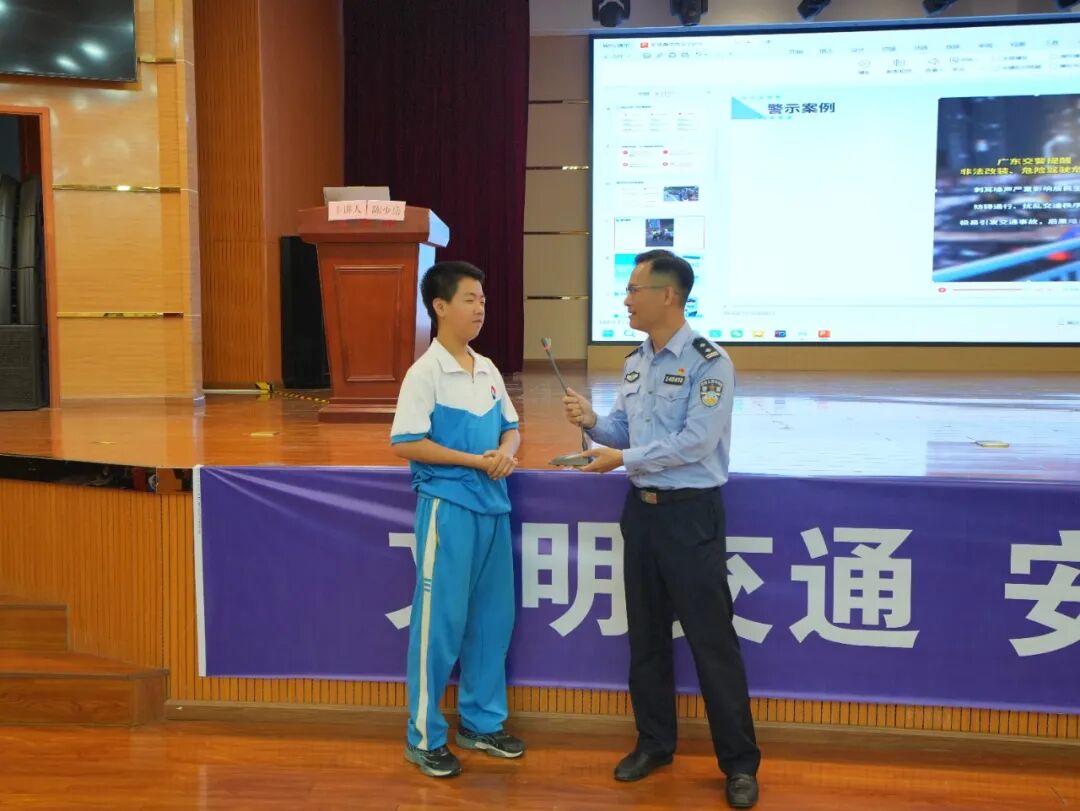活动中,民警结合中学生年龄和认知特点,介绍了中学生常见交通违法行为和普及交通安全常识。提醒学生未满12周岁不得骑自行车上路行驶,未满16周岁不能骑电动自行车,驾驶摩托车需要满18周岁并考取机动车驾驶证。重点讲解了“飙车炸街”违法行为的危害后果,剖析了驾驶非法改装摩托车等危险行为给自身生命安全、社会公众安全带来的安全隐患,要求学生们做到自觉拒绝“飙车炸街”,切勿以寻求刺激、炫酷取乐等为目的,将自己和他人的安全弃之不顾。
