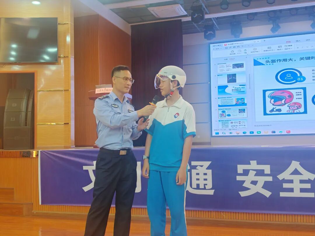 为使交通安全知识真正入脑入心,讲座设置了法律知识问答、头盔佩戴示范、谈心得感想等环节。围绕骑行年龄要求、乘车安全规范、“一盔一带”和“早点走 靠右行 慢慢开”骑行理念等核心要点内容,民警与现场学生进行了严肃而富有教育意义的互动。