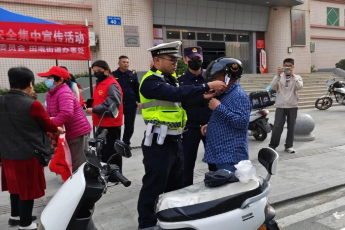 活动中,宣传人员在南联路口、新时代文明实践站、万家好等重要路口、路段设立劝导点,通过对未按规定佩戴安全头盔的摩托车、电动自行车骑乘人员进行拦截,结合典型事故案例,面对面地分析讲解事故成因,让群众深入了解头盔在关键时刻对生命安全的重要保护作用。同时,民辅警还通过分发宣传材料、发放安全头盔、示范安全头盔的正确佩戴方法等方式,引导大家树立“戴好头盔、安全出行”的安全防护意识,做到自觉预防事故,克服麻痹、侥幸心理,共同营造安全、文明、和谐的道路交通环境。