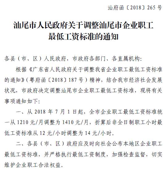 汕尾市人民政府关于调整汕尾市企业职工最低工资标准的通知