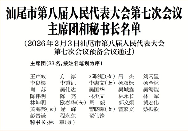 汕尾市第八届人民代表大会第七次会议 主席团和秘书长名单 (2026年2月3日汕尾市第八届人民代表大会第七次会议预备会议通过)