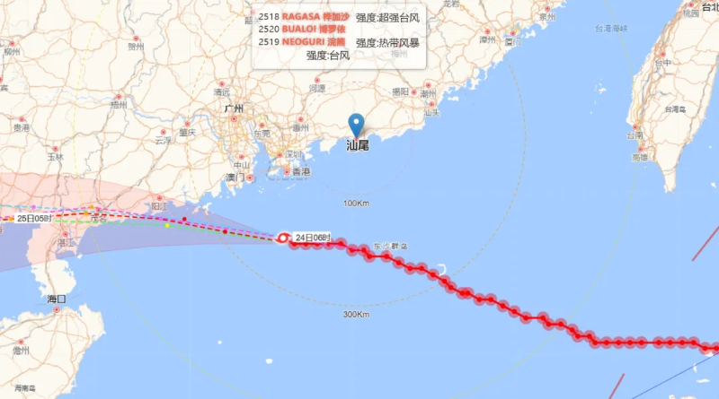 24日06时,台风“桦加沙”(超强台风级)中心位于距离我市南偏西方向约220公里的南海海面上,中心附近最大风力16级(55米/秒),10级风圈150公里,12级风圈半径90公里,将以每小时20-25公里的速度向偏西方向移动,继续远离我市,将于今天中午到晚上在台山到徐闻一带沿海登陆。