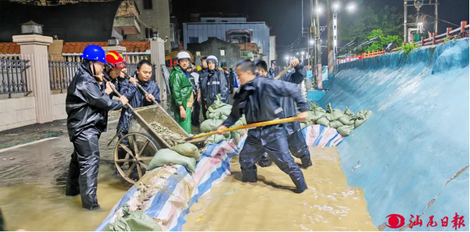 9月23日晚,陆丰市湖东镇应急救援力量紧急处理宁港社区海墘路因风暴潮导致排水沟返水险情。