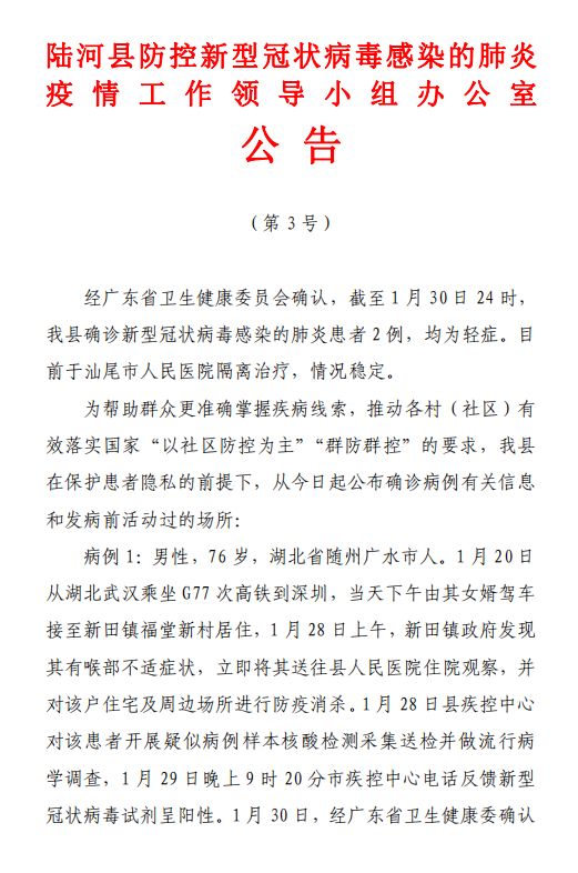 陆河县防控新型冠状病毒感染的肺炎疫情工作领导小组办公室公告(第3号)