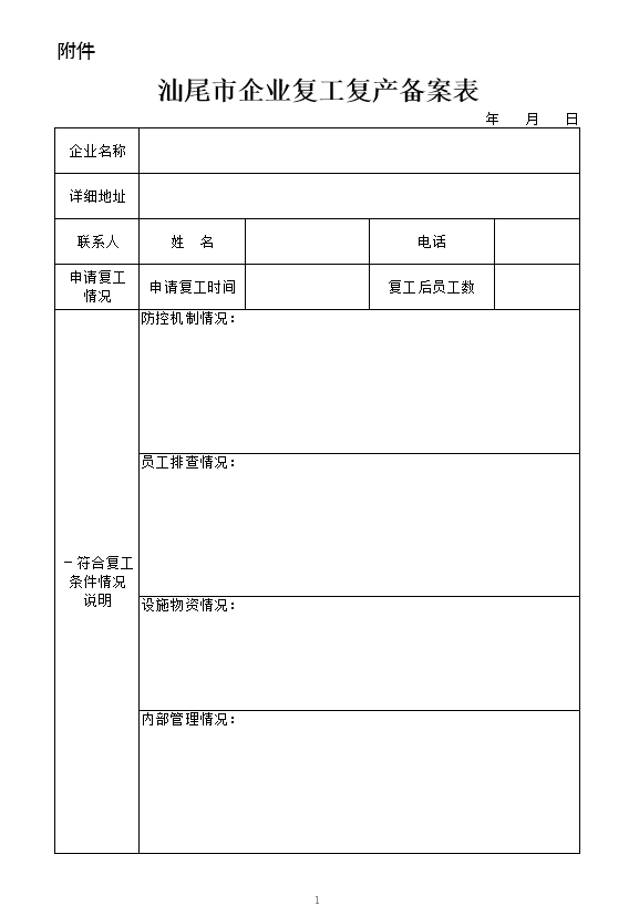 附件:《汕尾市企业复工复产备案表》