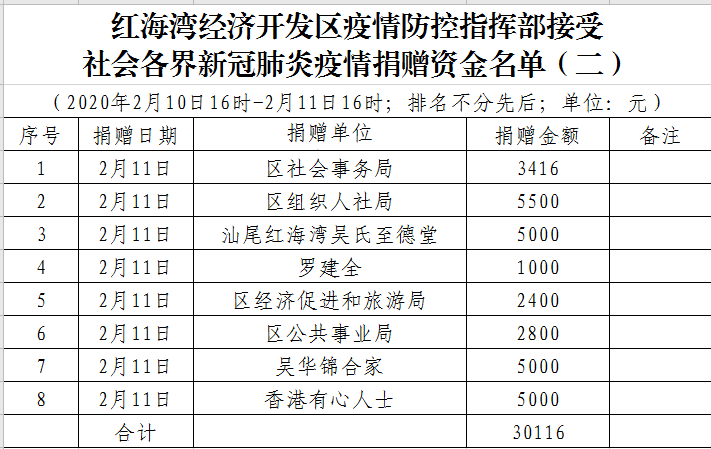 新型冠状病毒感染的肺炎疫情发生以来,区疫情防控指挥部积极发动、广泛动员,红海湾各界人士守望相助、慷慨解囊。2月10日16时至2月11日16时,指挥部接收捐赠款30116元,累计接收捐赠款72456元。捐赠款物由我区新型冠状病毒感染的肺炎疫情防控指挥部统一调度使用,用于我区疫情防控工作。