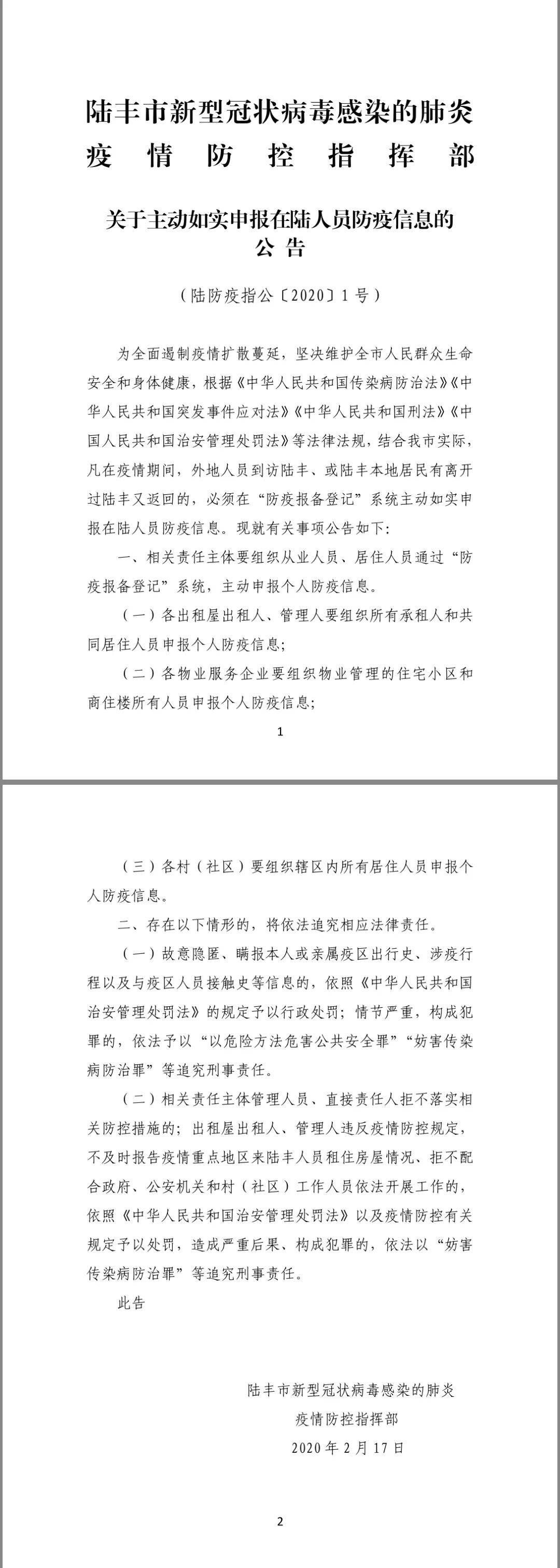 2020年2月17日,陆丰市新冠肺炎疫情防控指挥部发布1号公告,凡在疫情期间,外地人员到访陆丰、或陆丰本地居民有离开过陆丰又返回的,必须主动如实申报在陆人员防疫信息。