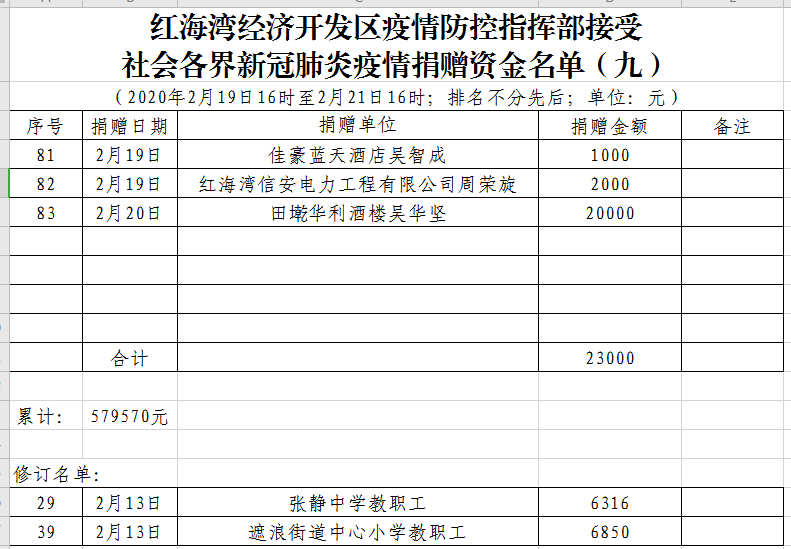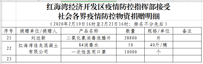 新型冠状病毒感染的肺炎疫情发生以来,区疫情防控指挥部积极发动、广泛动员,红海湾各界人士守望相助、慷慨解囊。2月19日16时至2月21日16时,指挥部接收捐赠款23000元,累计579570元,接收捐赠物资一批,在此一并表示感谢!捐赠款物由我区新型冠状病毒感染的肺炎疫情防控指挥部统一调度使用,用于我区疫情防控工作。