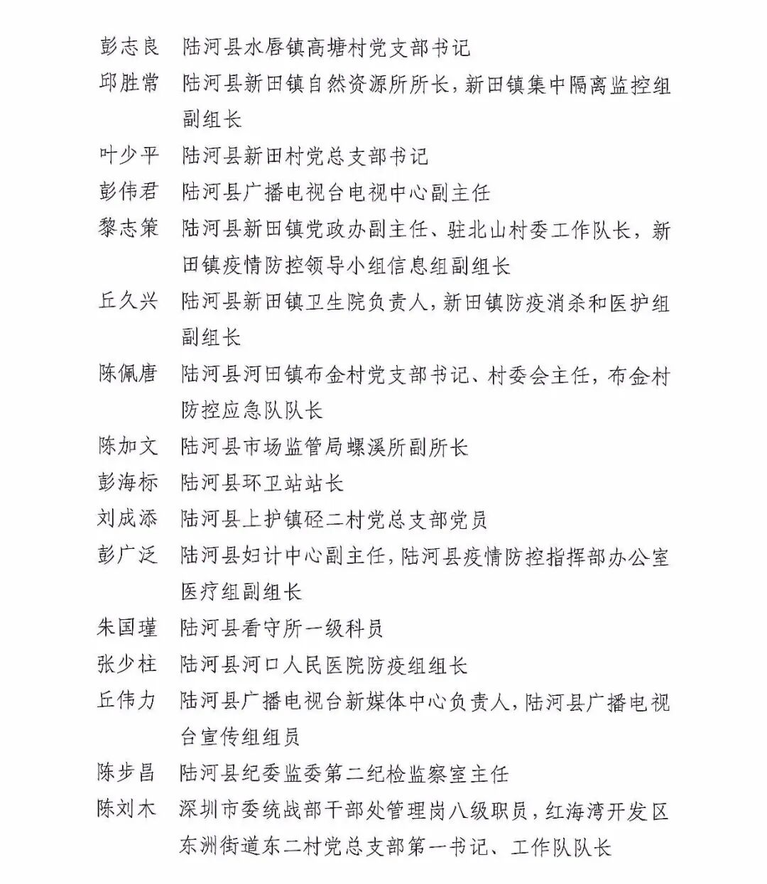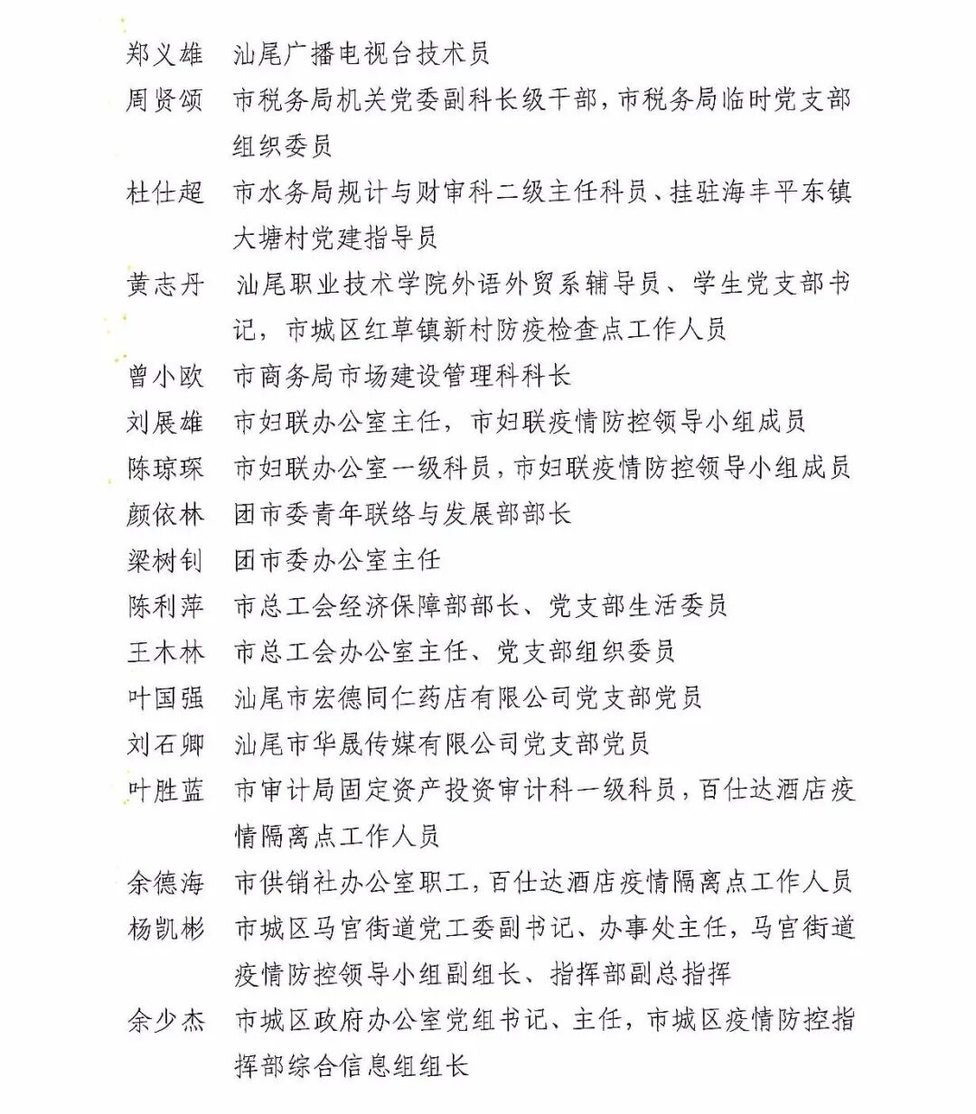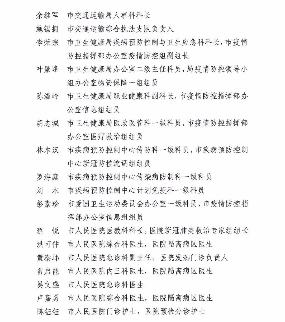 新冠肺炎疫情发生以来,全市上下坚决贯彻落实习近平总书记关于疫情防控工作的重要讲话和指示批示精神,按照中央、省委和市委部署,坚持把疫情防控作为最重要的工作来抓,各级党组织和广大党员干部视疫情为命令、以防控为己任,充分发挥战斗堡垒和先锋模范作用,全面用好“大数据+网格化+主动监测+群众路线”四轮联动,织细织密联防联控、群防群控“两张网”,全力做好“外防输入、内防扩散”各项防控工作,把初心落在行动上、把使命担在肩膀上,涌现出一批政治坚定、冲锋在前、顽强拼搏、无私奉献的先进集体和个人。