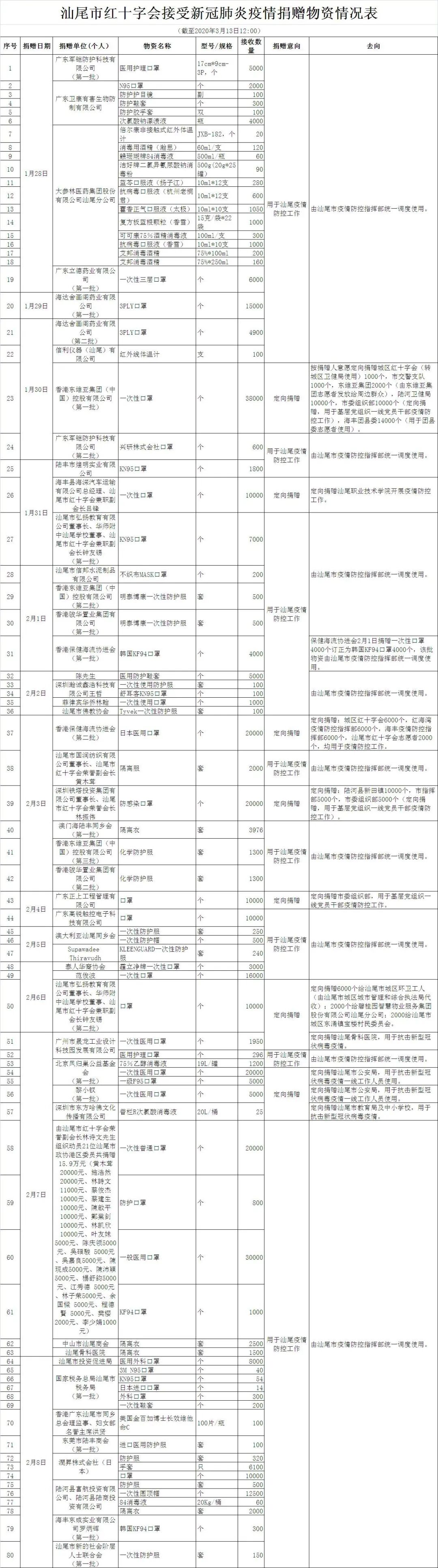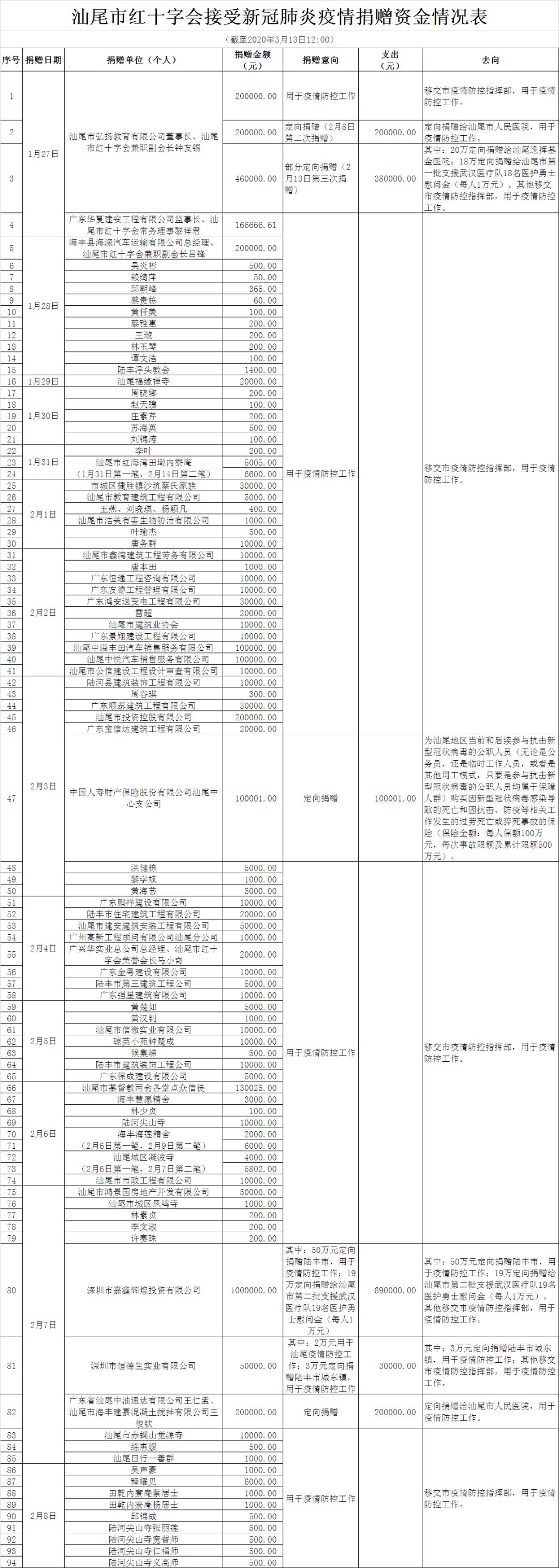 截至3月13日12时,汕尾市红十字会本级累计接受捐赠款物共计18185081.99元,其中,接受捐赠资金共6152831.61元,接受物资总价值折合人民币12032250.38元。