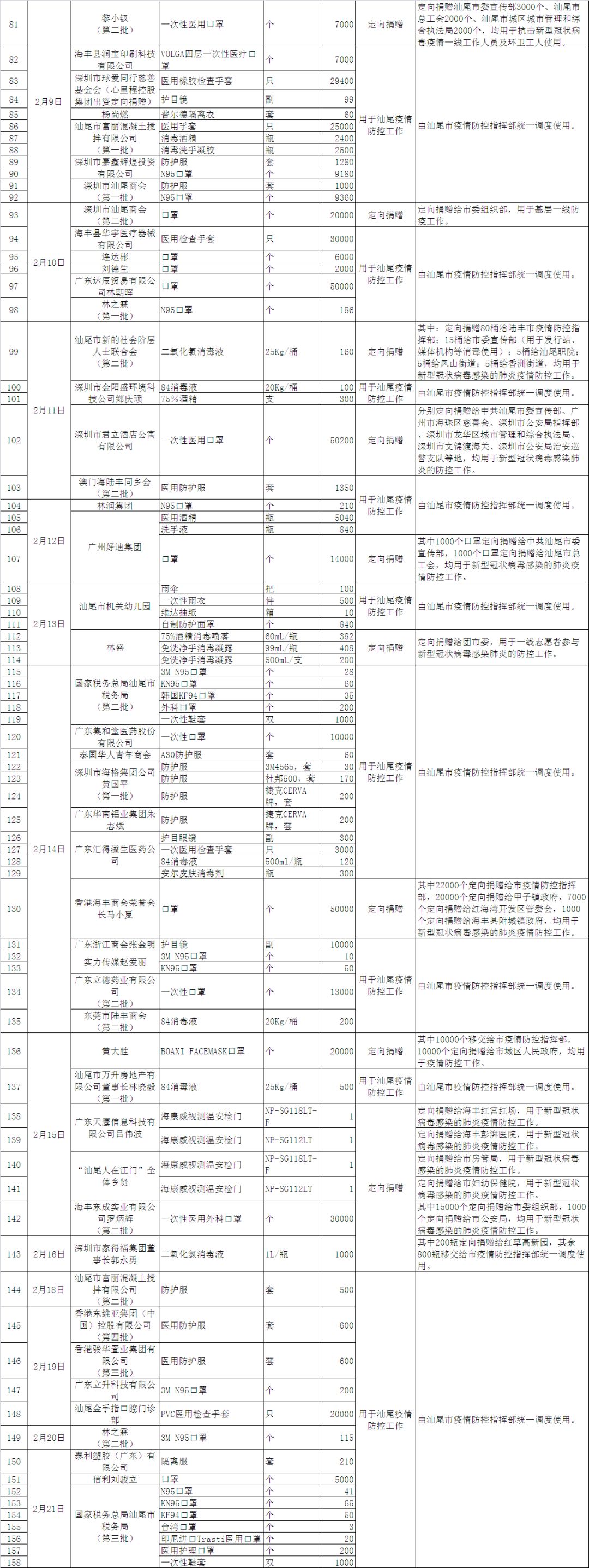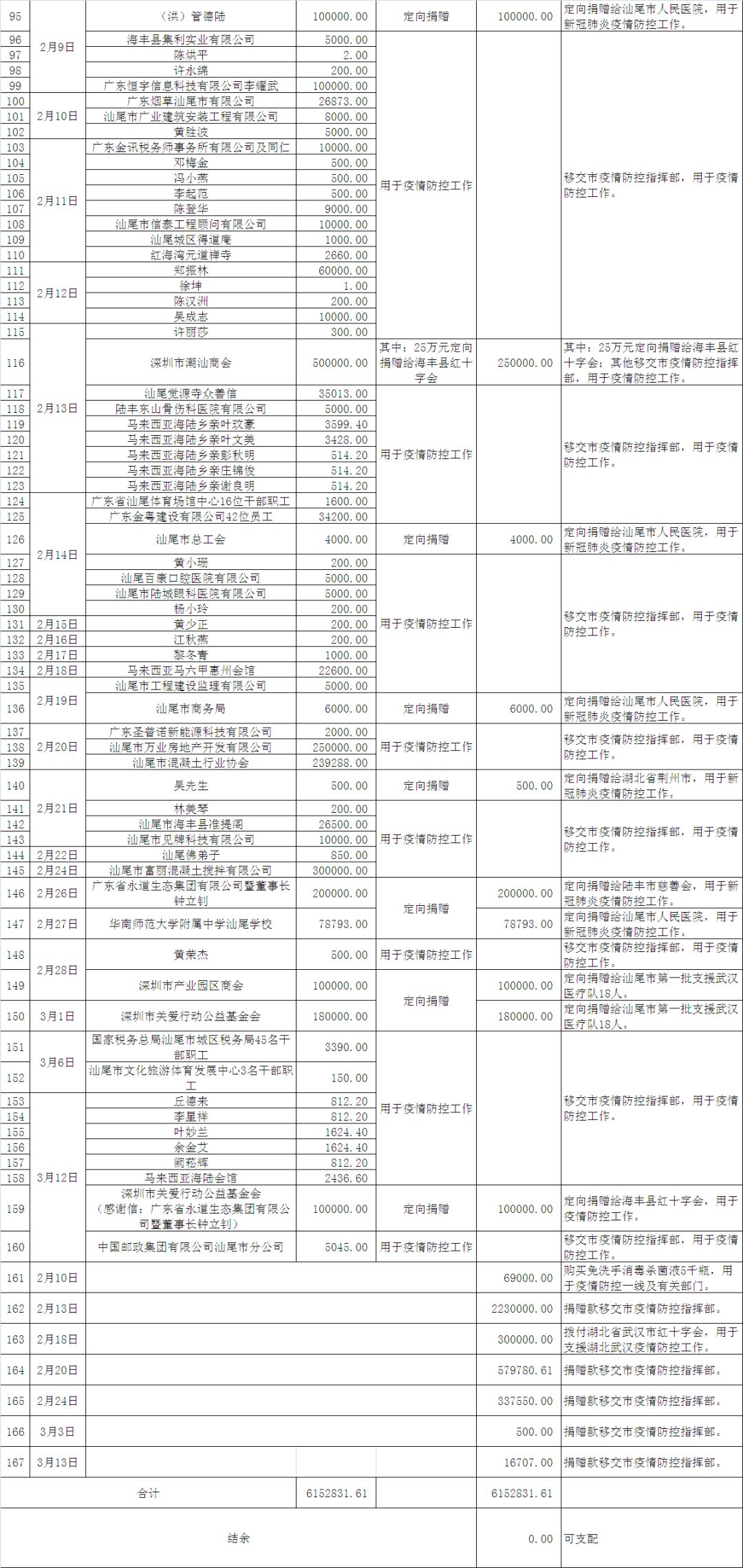 本级累计拨出款物共18185081.99元,其中:拨出资金6152831.61元,拨出物资折合人民币12032250.38元。本级款物累计结余0元,累计接受捐赠款物拨付率达100 %。捐赠款物全部严格按照捐赠人捐赠意向及市疫情防控指挥部要求统一调度使用。现公示如下: