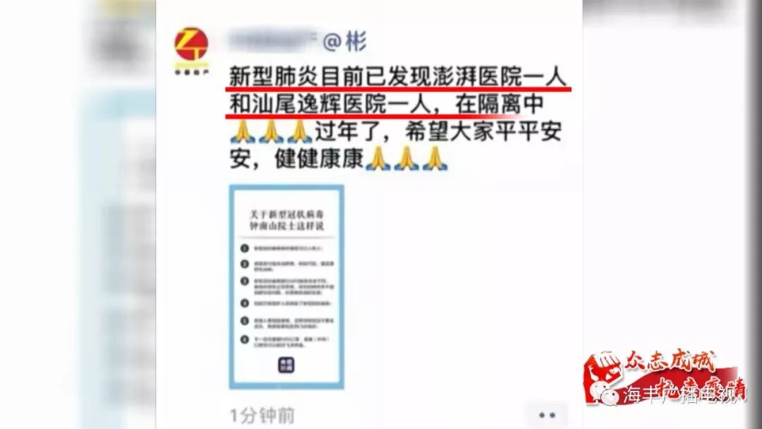 1月21日,接市公安局关于核查微信网民“中泰地产@彬”在朋友圈发布 “新冠肺炎目前已发现彭湃医院一人和汕尾逸挥医院一人,在隔离中”的要情信息后,海丰县公安局立即组织网警大队和云岭、莲花山派出所进行核查,锁定海城镇中泰地产中介商铺的金某涉嫌散布谣言,于当天21时30分对金某进行传唤。