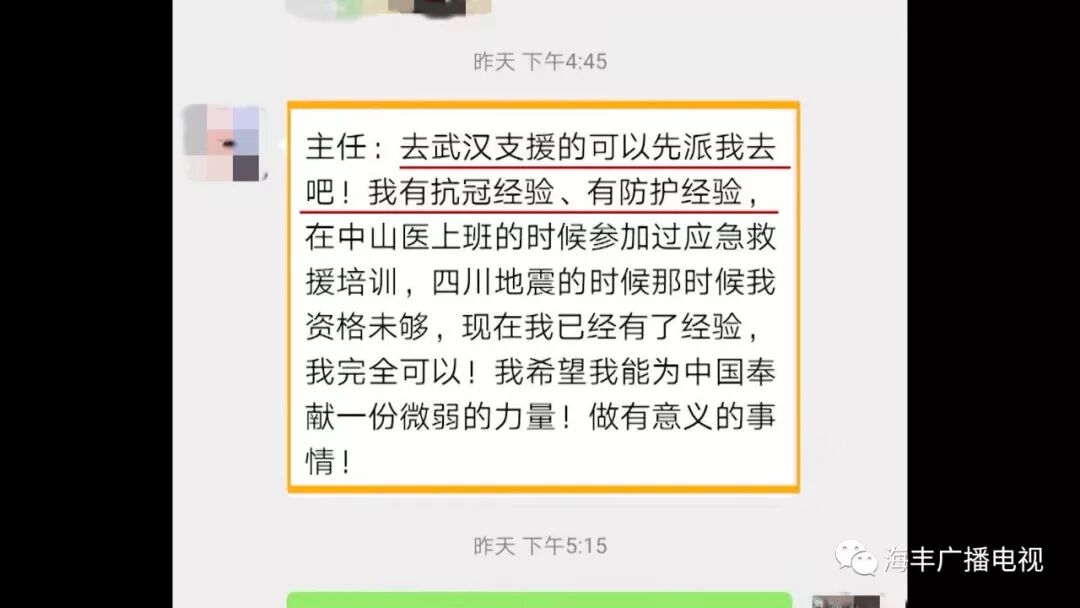 如果能够被选中,参加到新一批志愿赴武汉疫情防控前线医疗队,我一定圆满完成上级交给我们的任务,展现我们海丰革命老区医疗队伍的风采,不辱使命!