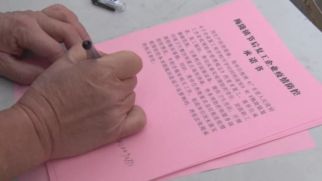 企业负责人: 我作为梅陇镇首饰工业的业主,我感谢镇政府为我们提供开工指引,在指导我们做好疫情防控的同时,为我们企业复工提供服务与方便,我们开工以后还要做好工人的防疫防护措施。