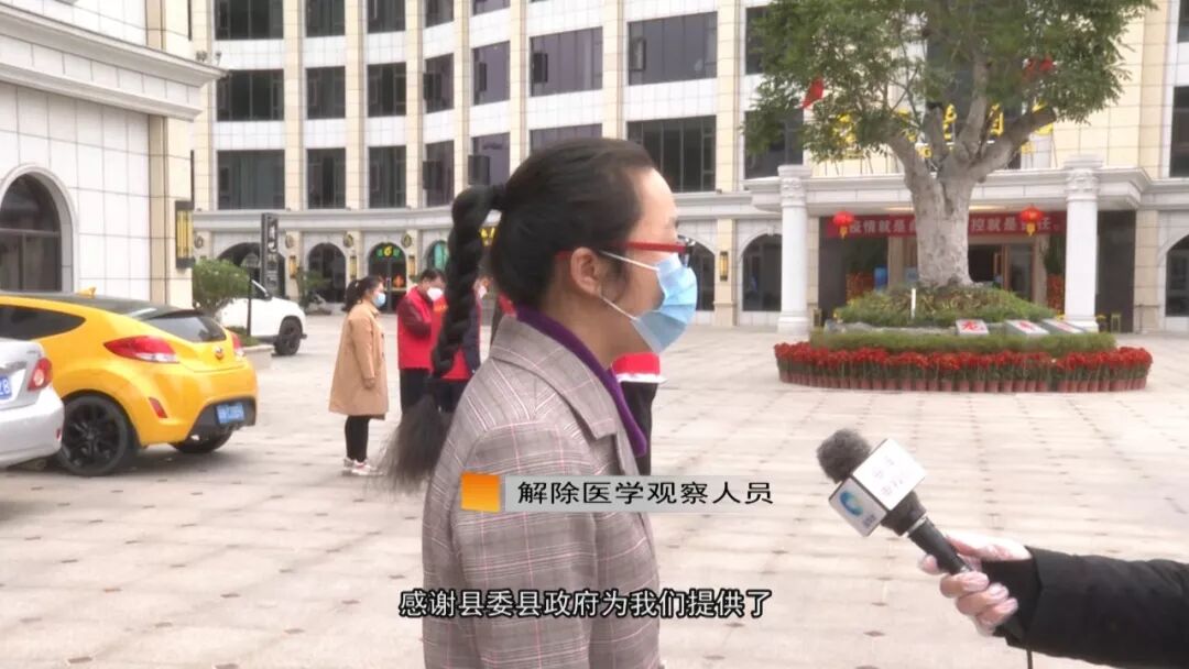 解除医学观察人员: 感谢县委、县政府为我们提供了非常充足的生活保障,保障了我们一日三餐,提供水果、牛奶等,让我们感觉到家的温暖。