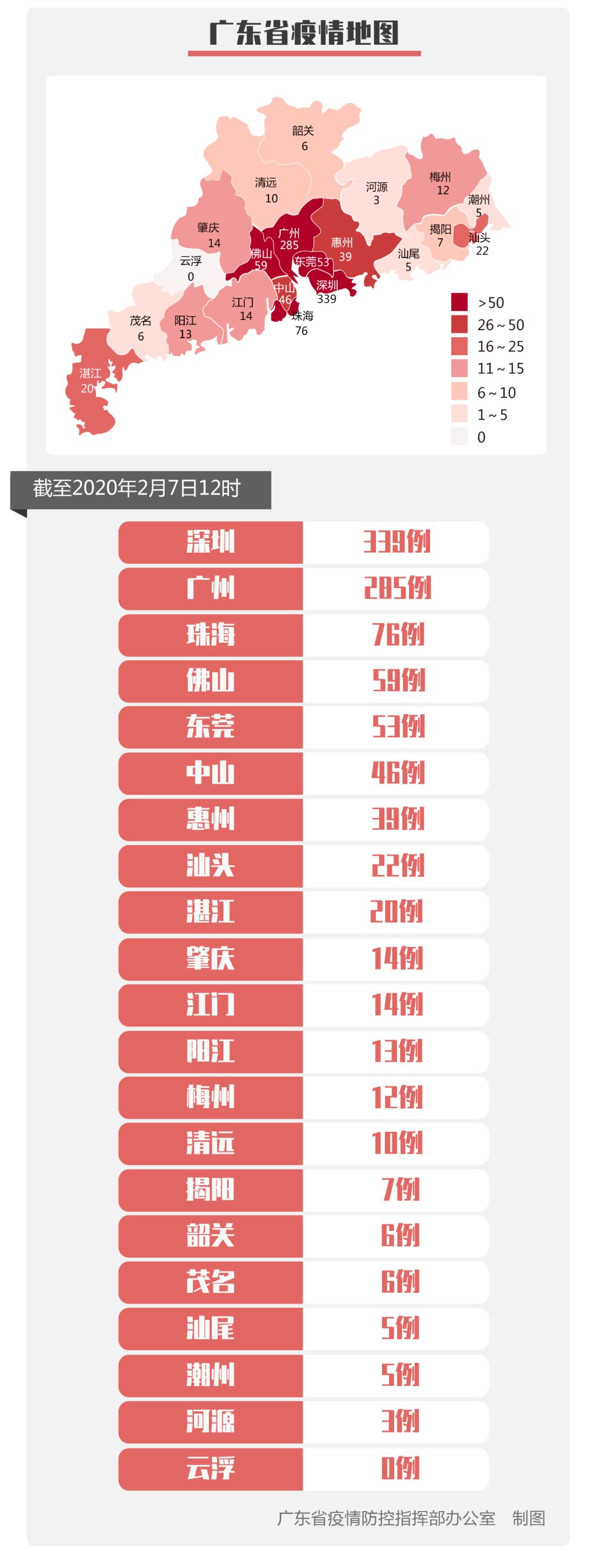 截至2月7日12时,全省累计报告新型冠状病毒感染的肺炎确诊病例1034例。7日当天0-12时全省新增确诊病例16例。新增确诊病例中,深圳市5例、珠海市3例、江门市3例、佛山市2例、湛江市1例、河源市1例、广州市1例。另有疑似病例177例。有3522名密切接触者正在接受医学观察。