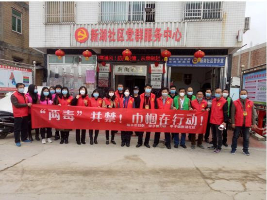 陆丰市妇联 陆丰市妇联始终坚持全面贯彻落实习近平总书记有关打好打赢新型冠状病毒感染肺炎疫情阻击战和禁毒人民战争指示批示精神,坚决执行市委、市政府相关“两毒”并禁决策部署,坚守使命担当,积极示范、引领、组织全市妇联干部、巾帼志愿者以线上线下等多方式开展“两毒”并禁宣传工作,努力为陆丰市做好“两毒”并禁工作贡献巾帼力量。2月7日,市妇联党组书记、主席刘娟带领班子成员深入新湖社区组织开展“两毒”并禁宣传活动。陆丰市妇联党组书记、主席刘娟一行、驻新湖社区两级禁毒工作组、镇驻社区领导、新湖社区全体干部、瀛南派出所民警、社区禁毒清理队、社区戒毒社区康复工作站社工和社区巾帼志愿者共24人参加了活动。