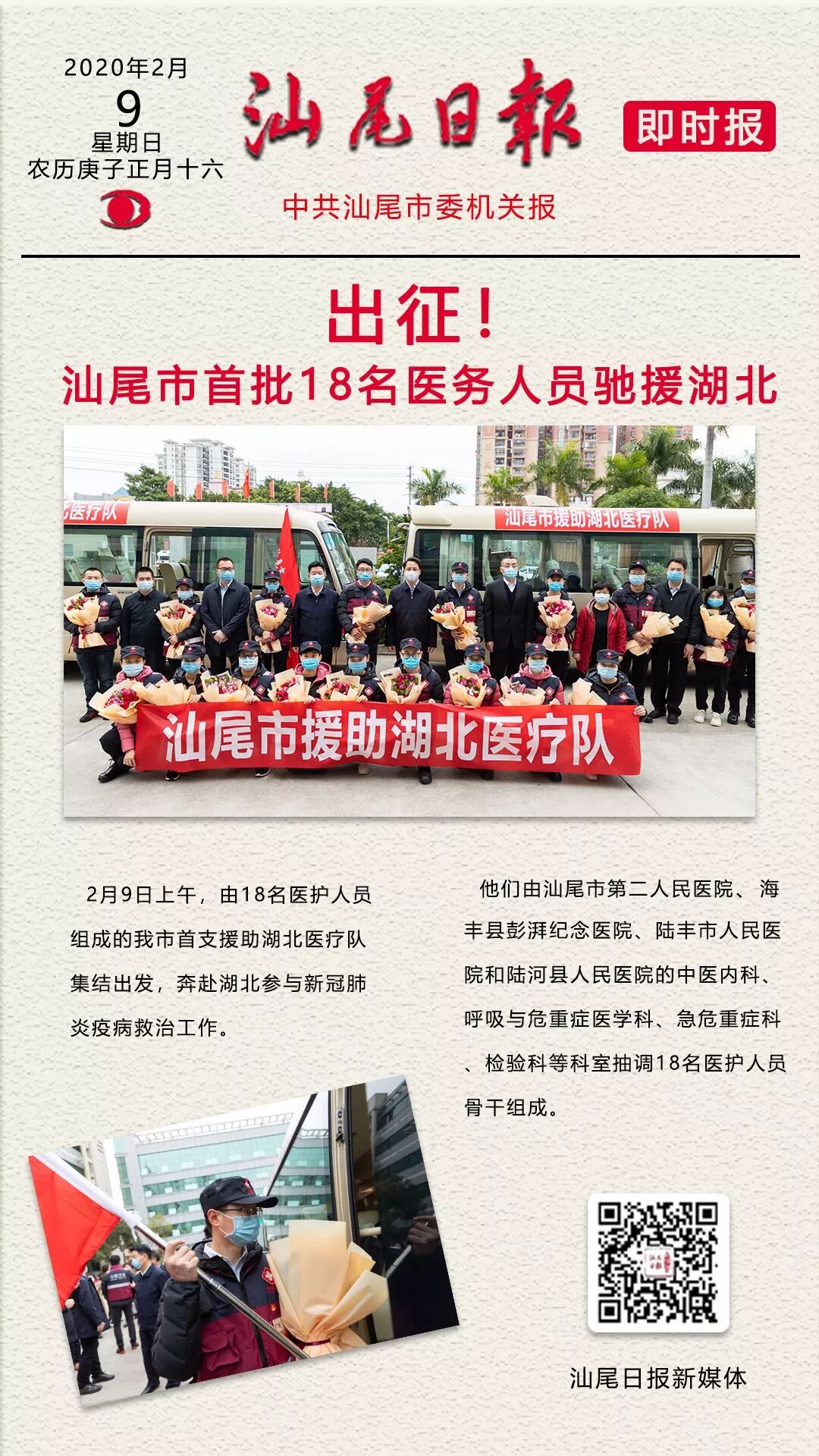据悉,日前接省卫生健康委要求组建医疗队驰援湖北的通知后,我市紧急动员,从汕尾市第二人民医院、海丰县彭湃纪念医院、陆丰市人民医院和陆河县人民医院的中医内科、呼吸与危重症医学科、急危重症科、检验科等科室抽调18名医护人员骨干,迅速集结组成援助湖北医疗队。医疗队员中有16人是80后、90后,其中9人为党员或预备党员,并成立了医疗队临时党支部。