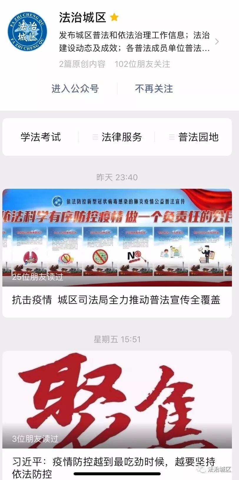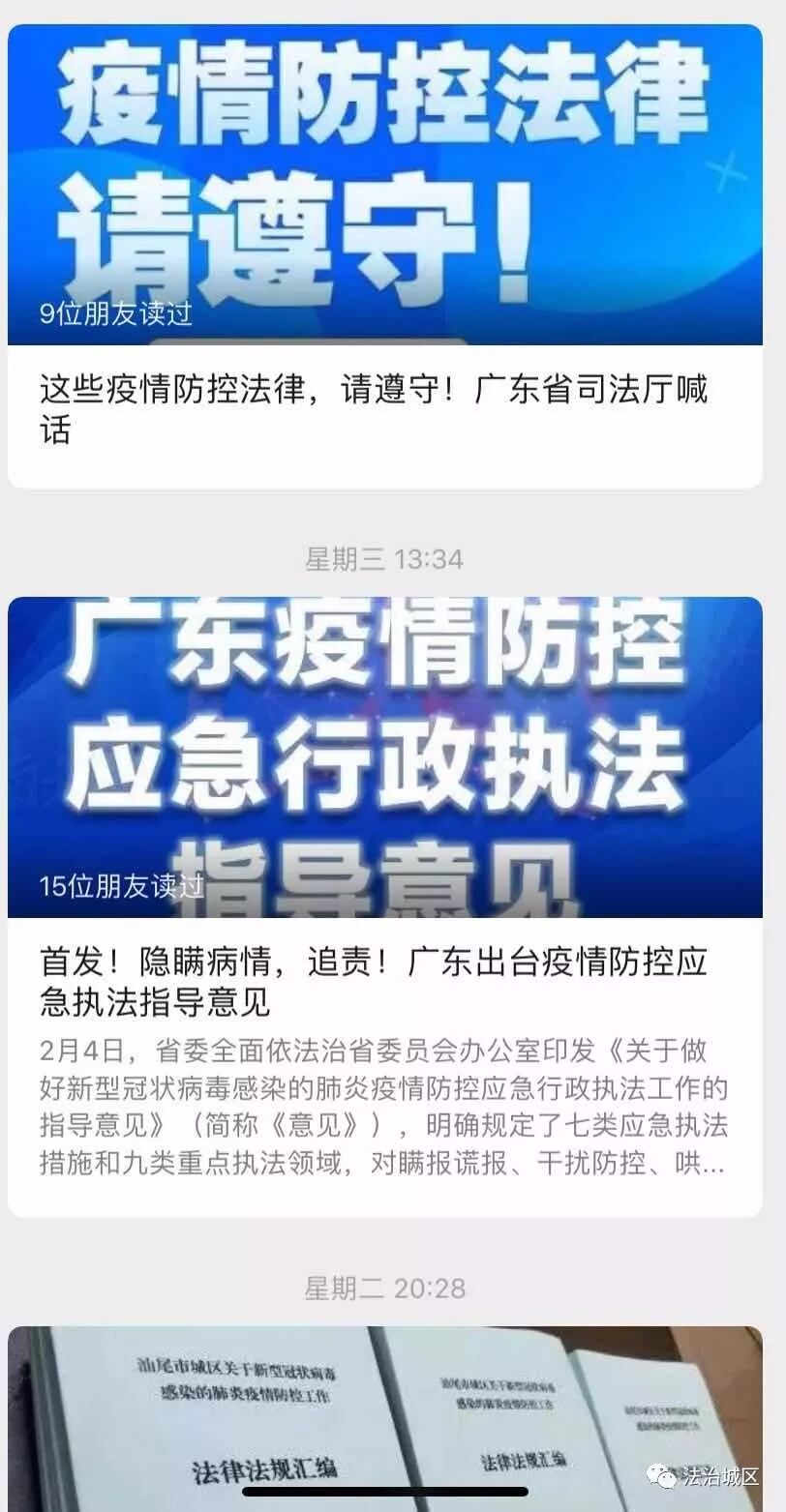 利用“法治城区”公众号推送、转载中央、国务院和省、市相关公告、工作动态、防疫知识、宣传视频等。截至9日,累计推送信息16条。