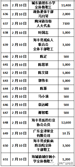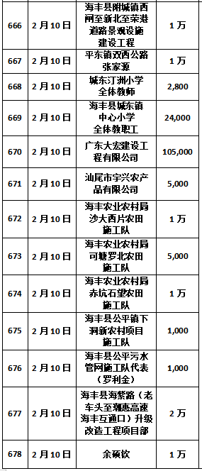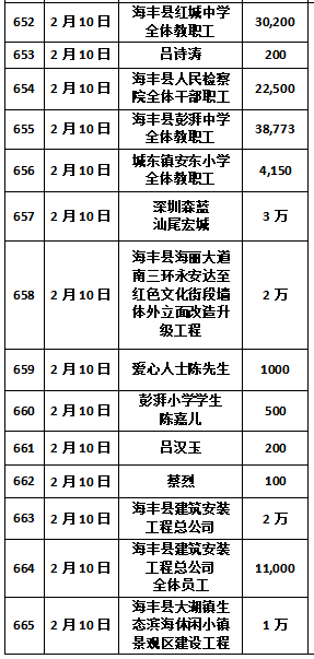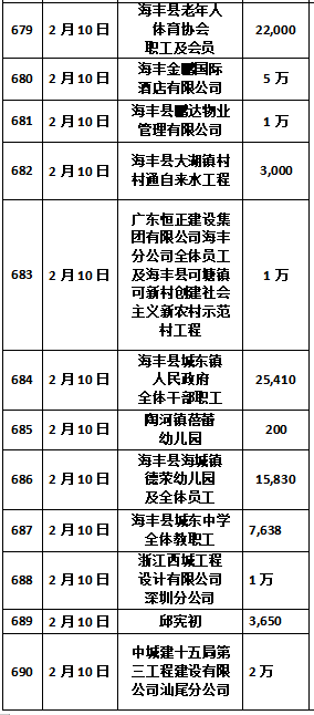 现将第十批资金及物资明细情况公示如下: 海丰县红十字会接受社会各界捐赠名单(截至2020年2月10日16时;排名不分先后;单位:元)
