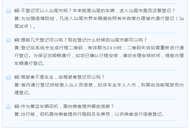驾驶人在出发前,点击进入“省内通行登记(汕尾试点)”服务,选择相应的车辆类型,阅读服务须知后填写驾驶人信息(注意准确填写号牌种类),如独自驾驶,确认无误后可直接提交。