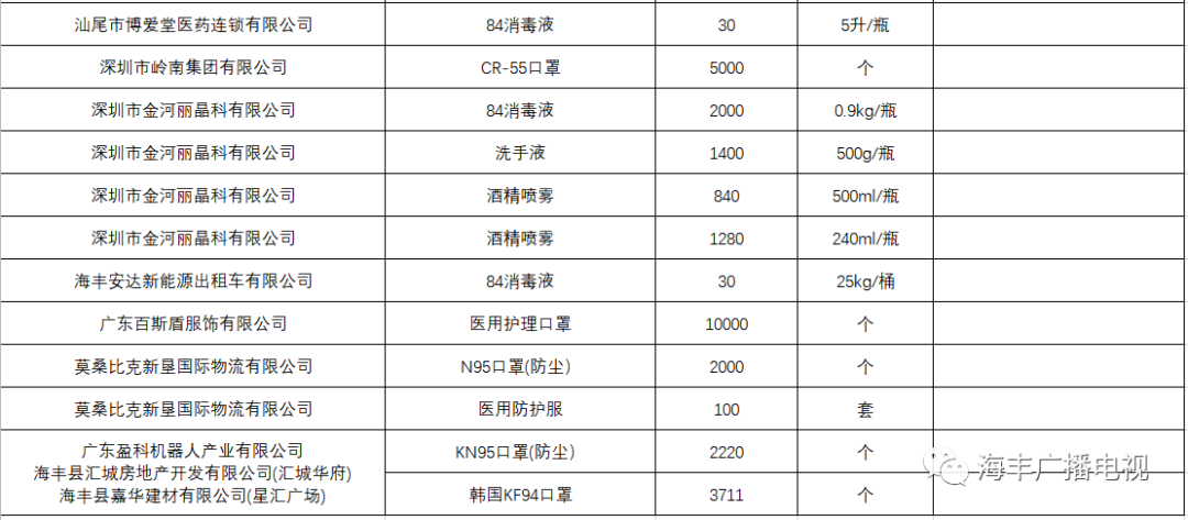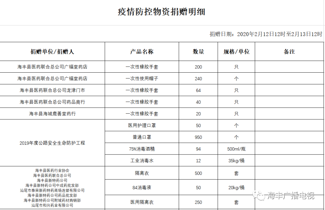 海丰县新型冠状病毒感染的肺炎疫情防控指挥部接受物资明细情况: