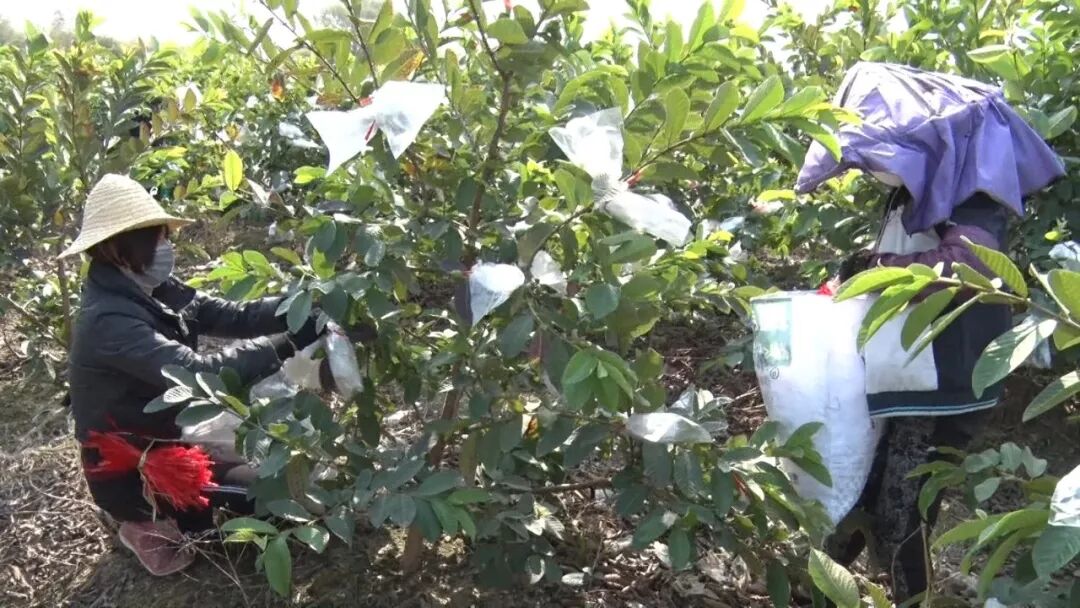 在该镇赤山村三铺种养合作社种植大户黎秋怀的番石榴种植基地,为避免人员密集,他叮嘱社员戴上口罩,工作时必须拉开安全距离,增强自身防护意识。分批分次地对栽种的200多亩番石榴进行除草、施肥、套塑料袋,保障番石榴正常生长。黎秋怀告诉记者,每年这个时候是番石榴结果最多的季节,如果不把这些番石榴套上塑料袋,必然会影响到收成。疫情防控当前,不能让春耕生产落后。