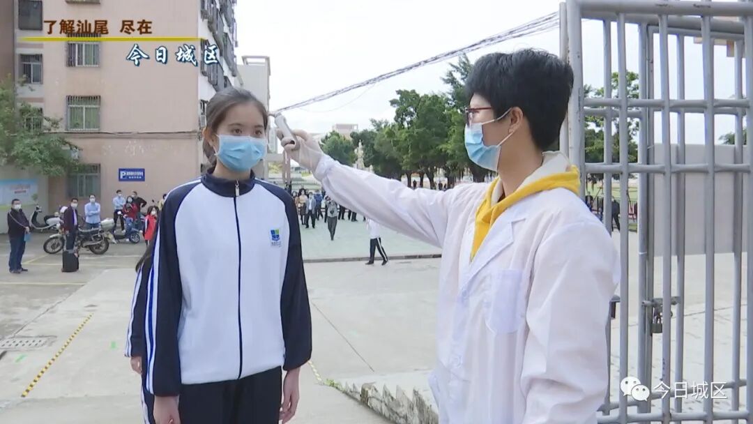 活动就学生如何入学返校举行校园疫情防控应急演练,演练模拟了学生分班分批、错时错峰返校、就餐、就寝,分为校门、教室、食堂、宿舍等四个场景。操作流程分消毒消杀、体温测量、就餐就寝以及发现发热人员时的应急处置等环节。演练中,参与晨午检的疫情监测组老师、值日行政提前到达学校,在检测自我体温后,对场地、设备进行了消毒处理,全面做好准备迎接学生晨午检。学生到达校门后,被要求佩戴口罩,有序地排队入校门检测体温,学生之间间隔1米,不得聚集。检测组老师引导学生通过自动测温区,细心留意自动测温系统是否发出警报声。当有模拟发烧学生通过自动测温区时,警报声响起,测温人员手持测温枪对该生重测体温,发现体温超过37.3度,立即带其到隔离观察室,并上报学校总指挥;医生立即了解该生情况,填写个人信息表,医生现场作出初步研判,再由班主任通知家长带学生就医。