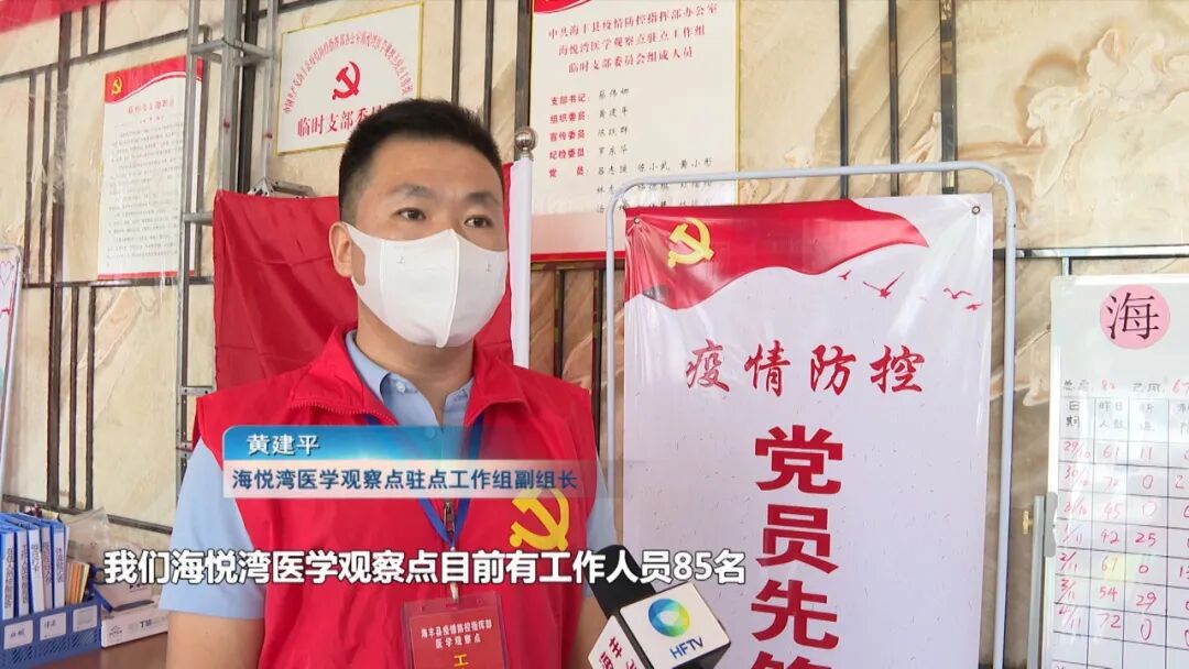 医学观察点驻点工作组副组长黄建平:我们海悦湾医学观察点目前有工作人员85名,分工作组、医疗组、公安和酒店服务人员四个组。每一个隔离对象入住医学观察点,我们都会详细地核实人员身份信息,并做好消杀工作和核酸检测工作。