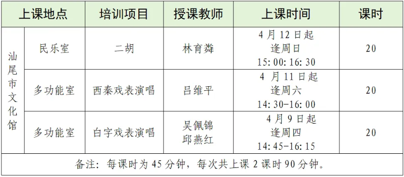 1.二胡班(20人)孙昕、彭芳娟、林淑曼、蔡淑婉、林运河、胡凤玲、陈梓峰、郑雨欣、马燕娜、吴晓莲、黄凤仪、陈雄斌、杨乐、李小玲、陈赢儿、戴蔓怡、刘元红、闫新龙、陈惠婷、谭淑琪 2.西秦戏表演唱班(40人)杨小丹、林剑锋、黄秀玉、曾丽珠、沈莲、黄蓓蓓、刘仕霞、廖海丽、曾健仪、陈惠波、钟小梅、王丽存、刘春颖、彭芳娟、庄惠娟、胡婷婷、陈子佳、蔡畅、许瑞华、曾宝真、徐细兰、陈淑娜、陈雪红、魏岚霞、钟玫瑰、徐少梅、陈淑芳、叶细妹、张梅红、卓祺皓、吴宝云、李小芹、彭小妹、林少敏、张惠红、林楚程、黎小青、蔡端玲、陈素绿、彭少清 3.白字戏表演唱班(39人)吕海、刘小彬、陈小冰、郑夏静、冯莲、许小京、刘仕霞、彭雪红、廖雪莲、尚小媛、王鹤、杨小丹、郑雅匀、黄秀玉、沈莲、陈惠波、钟小梅、陈淑芳、许瑞华、庄惠娟、曾宝真、徐细兰、陈淑娜、沈小琴、徐少梅、张梅红、李小芹、叶细妹、黎小青、彭小妹、吴宝云、林少敏、林楚程、洪嘉丽、郑丽婵、蔡端玲、张丽萍、陈素绿、彭少清 课程表 课程须知 一、参加公益培训者,不可无故弃课空额。须按时参加课程,凡无故缺课3次及以上者,将视为自动放弃培训资格,并产生不良记录。 二、学员在培训期间,请自觉遵守文化馆各项规章制度,服从安排;保护馆内公共财产,如有损坏需照原价赔偿。 三、公益培训班只为学员提供师资、场地、教学设施设备。培训中所需的学习用具、教材、乐器和服装道具等,由学员自备。 四、鉴于本馆的公益培训项目属非营利、自愿参与性质,参与者需自行承担活动中的潜在风险及责任;少儿学员培训期间须有家长陪同,确保学员安全。 五、若遇特殊情况(如恶劣天气等)需对课程安排进行适当调整,敬请理解并支持与配合我馆工作。