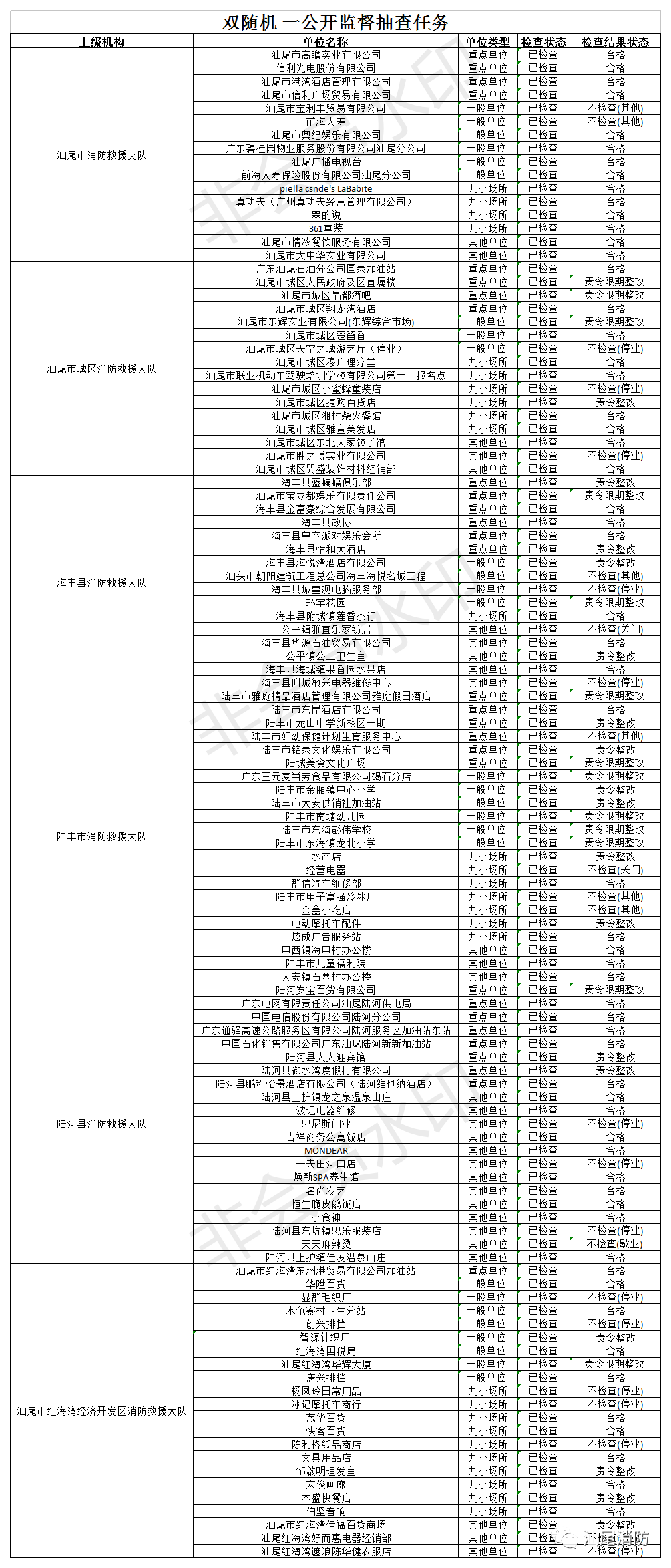 为深入推进全市火灾防控工作,进一步预防和减少火灾危害,保障公共安全,督促各单位、各场所履职尽责,根据有关法律法规规定,汕尾市消防救援支队依法对汕尾市有关单位进行消防监督抽查,现将2020年6月份“双随机、一公开”消防监督抽查结果公示如下: