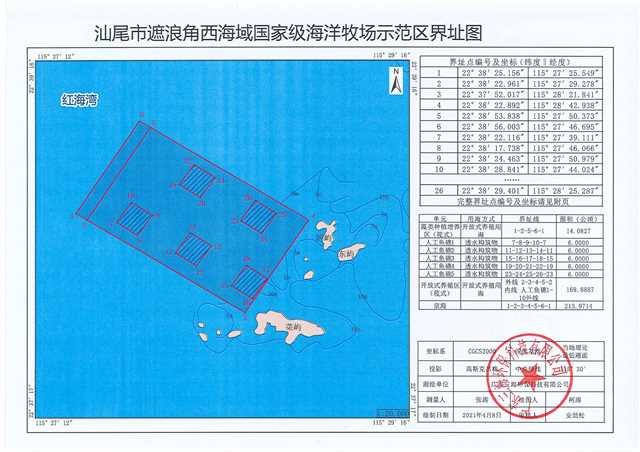 广东省汕尾遮浪角西海域国家级海洋牧场示范区建设项目申请用海总面积213.9714公顷,包括筏式藻类种植增养区申请用海14.0827公顷、筏式开放式养殖区申请用海169.8887公顷、人工渔礁区申请用海30公顷。