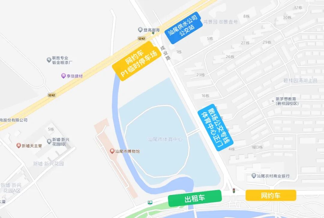 四、出租车临时上下客停车点位于海滨大道汕尾市体育中心路段,可步行前往临时停车点乘车。
