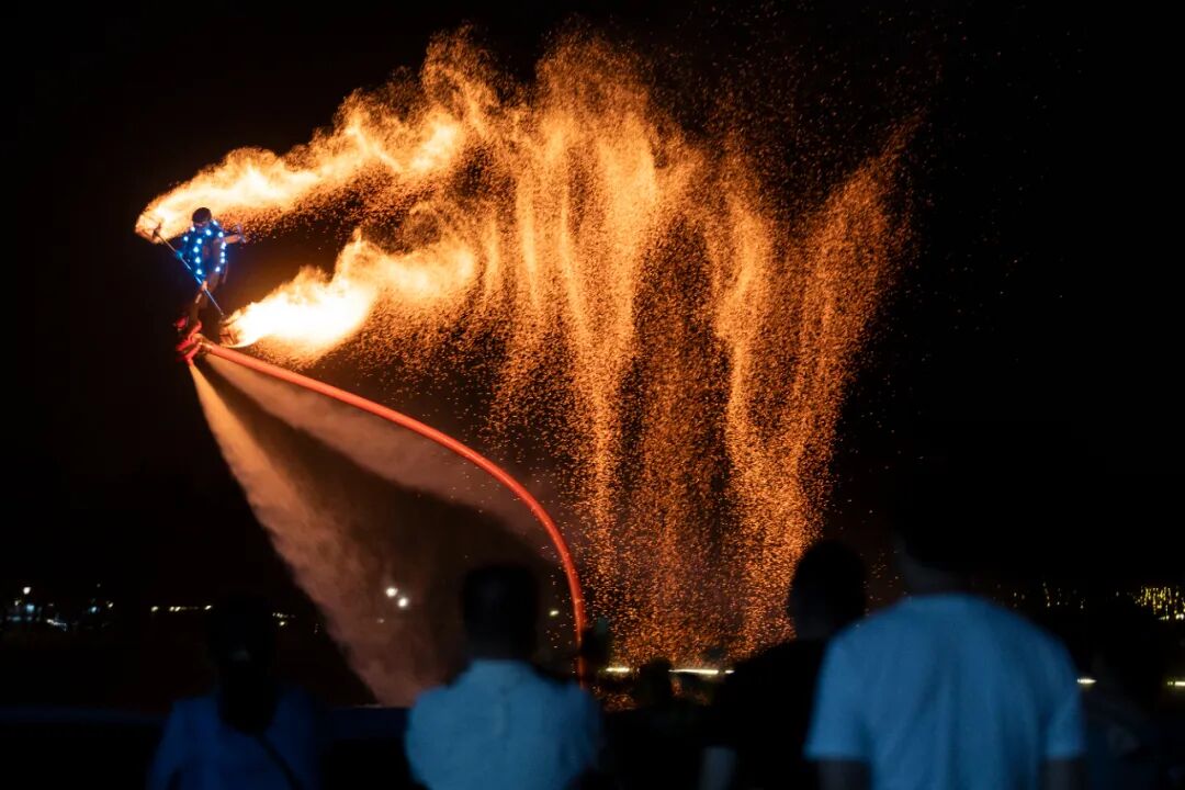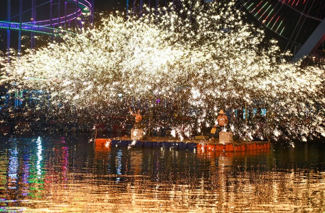 10月2日,非遗传承人在江苏南京七桥瓮湿地公园内展示打铁花技艺。新华社发(杨素平 摄)