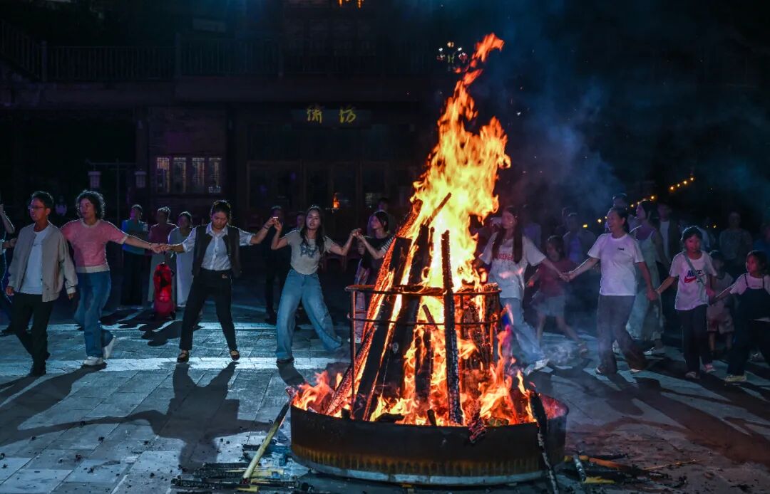10月5日晚,在贵州省晴隆县阿妹戚托小镇,游客与当地群众围着篝火共舞。新华社记者 杨文斌 摄