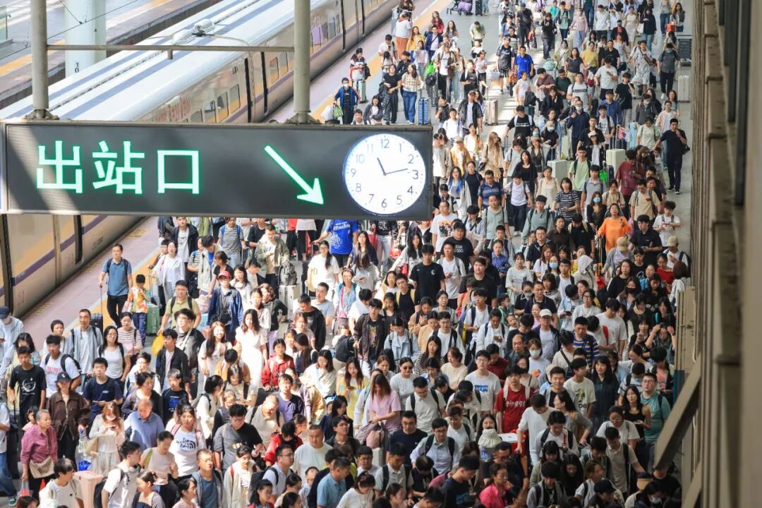 10月7日,旅客在南京火车站有序出站。 新华社发(苏阳 摄)
