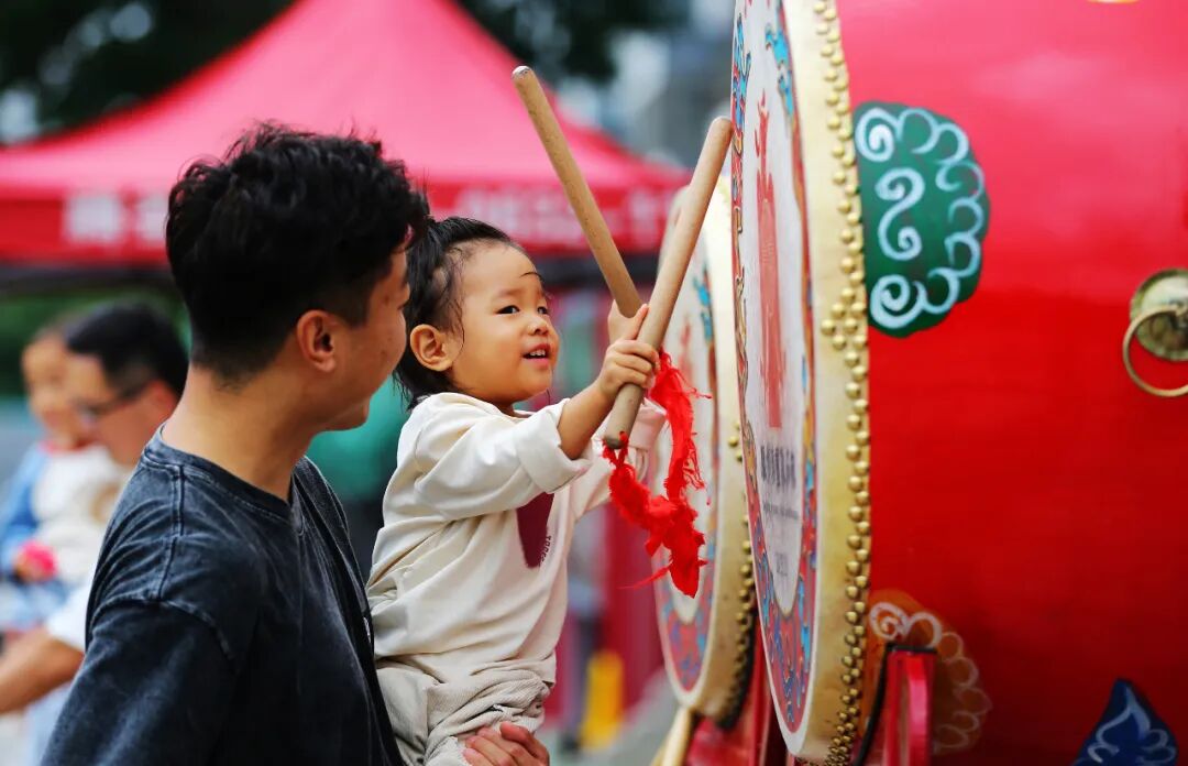 10月6日,在山东省滕州汉画像石馆门外,家长陪着孩子体验击鼓。新华社发(李志军 摄)