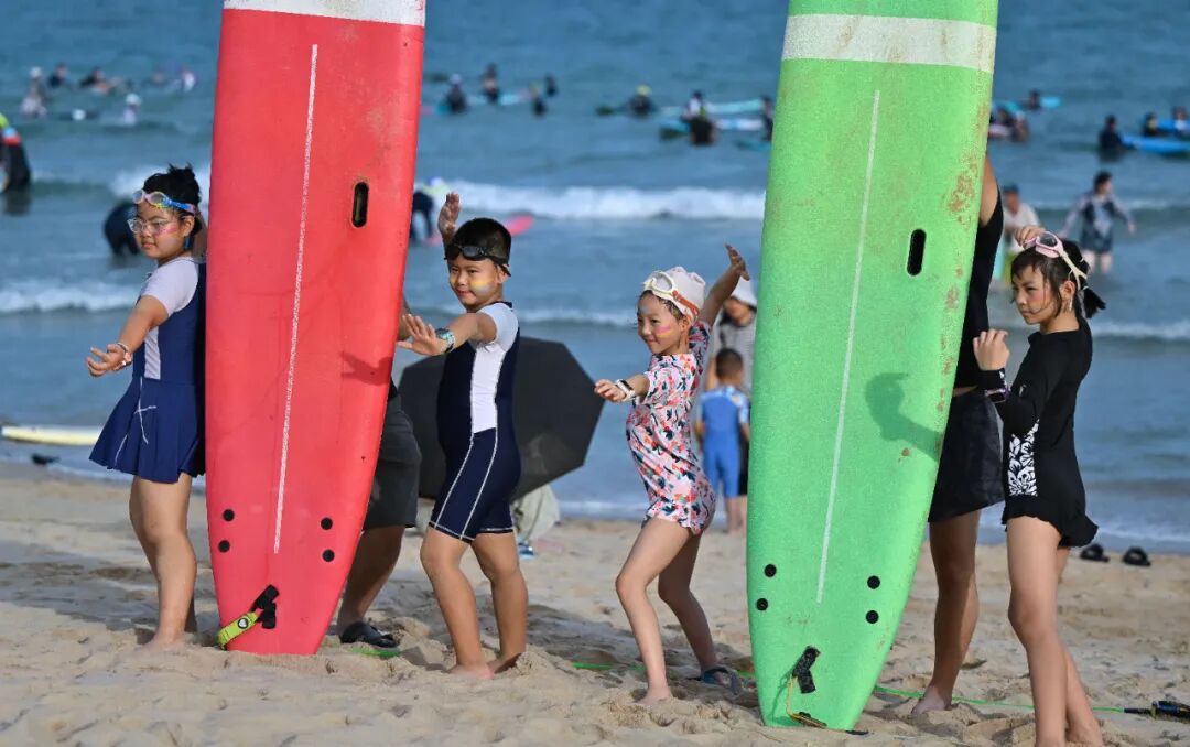 10月2日,准备体验冲浪的小朋友在海南万宁日月湾合影留念。新华社记者 郭程 摄